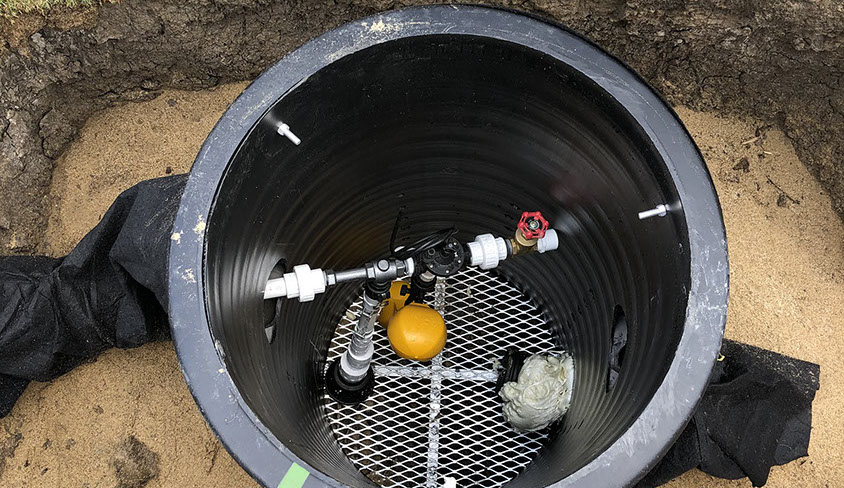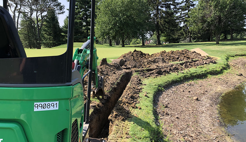 The pond adjacent to the 11th green was backfilling our greens drainage cavity causing the sub soil to remain saturated at all times. We exposed our two outfall drainage pipes coming out of the green and dug a 100 ft trench beside the green allowing us to install a new 4 inch drainage line connecting the back and front outfall pipes together no longer allowing water to backflow into the greens drainage. The new drainage line connected into a basin to the right of the approach, where we installed an IDP (Irrigation Driven Pump) to discharge the water into the pond, which allowed the pond level to remain the same and not affect the soil moisture of the greens cavity.